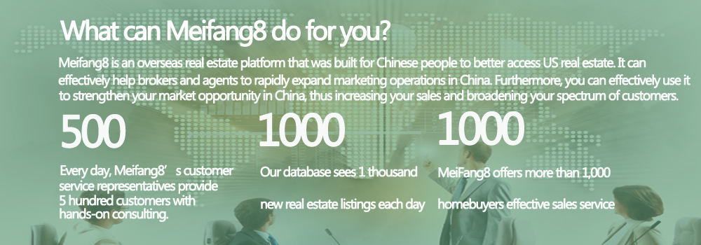 Meifang8 provide U.S. Realty Investment Services for the Chinese market online and offline, including buyer intermediary, seller intermediary, foreclosures, installation and rental management services. We provide the latest, most accurate and authentic selection of the most popular neighborhoods for Chinese homebuyers in real time, including information about new homes, school districts, investment, mansions, and commercial real estate, leasing over one million U.S. listings. Our professional consulting managers will provide you with a variety of realty pre-service.