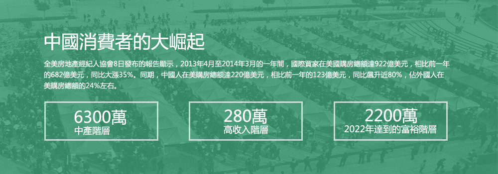 從購置溫馨的精緻公寓到華麗的頂級豪宅,海外房產市場的中國購房者擁有最快的增長率。中國購房者在美國房地產市場上的支出從2009年的69億美元迅速攀升至2013年的220億美元。數年間,中國投資移民美國申請人數量也翻了數倍。