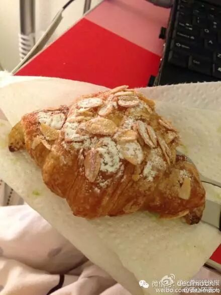 3.Whole Foods里面卖的Almond Croissant,我觉得是来美之后吃到最好吃的牛角包, 外皮酥脆,里面却不乏Q弹,还有夹心。尝到了树桂的味道,类似国内豆沙,小甜。我是很不爱吃甜食的人。在烘培区,应该是现烤现卖
